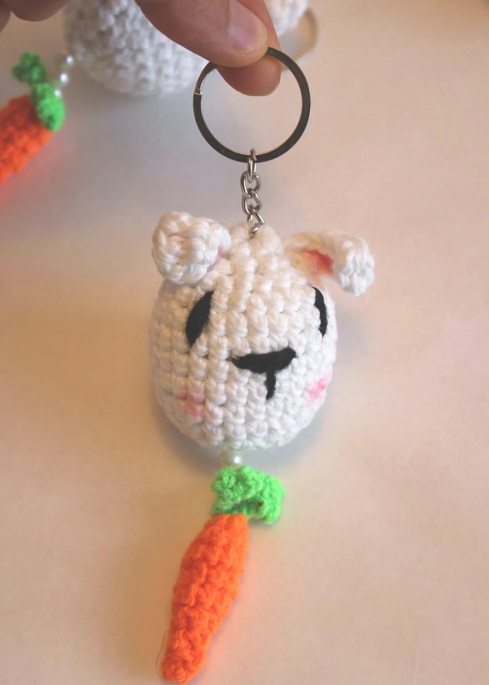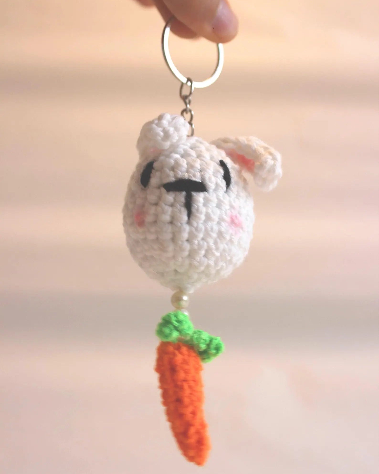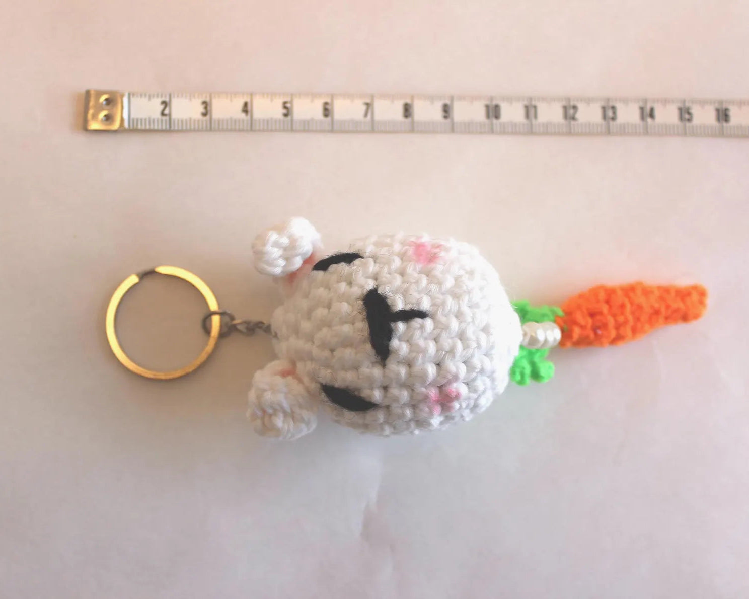 Dieser handgemachte Mini-Hase trägt stolz seine kleine Karotte bei sich – ein detailverliebtes Accessoire, das jeden Schlüsselbund, jede Tasche oder jeden Rucksack zum Hingucker macht.