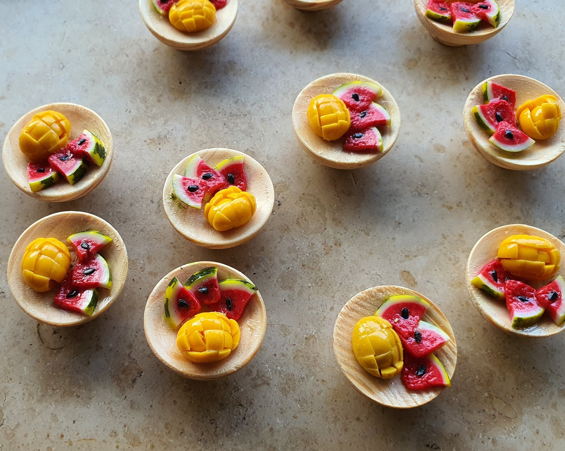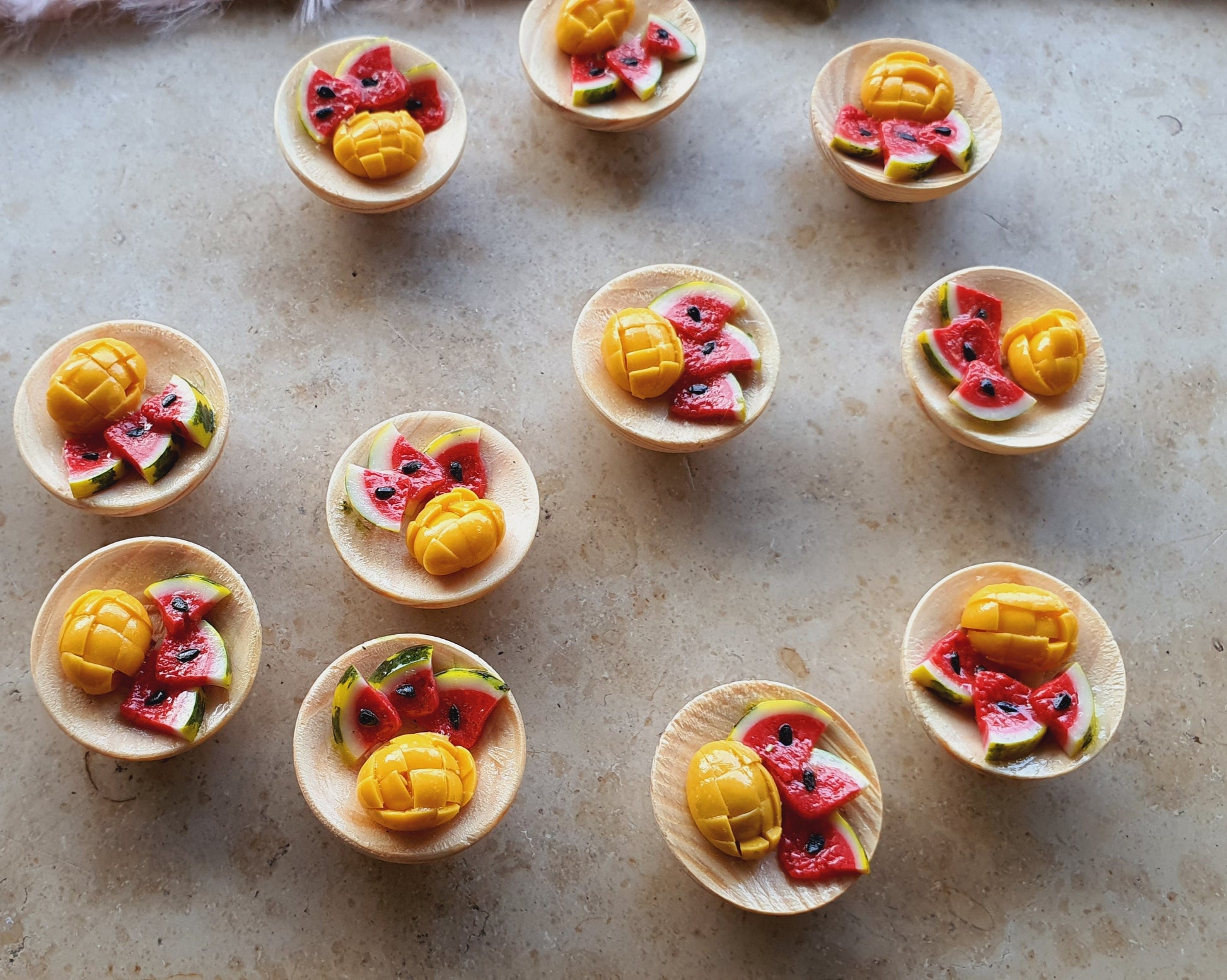 Diese liebevoll gestaltete Miniatur-Fruchtschale mit Mango und Wassermelone ist ein farbenfroher Hingucker – perfekt für den Kühlschrank, das Büro, dein Zuhause oder die Puppenstube.