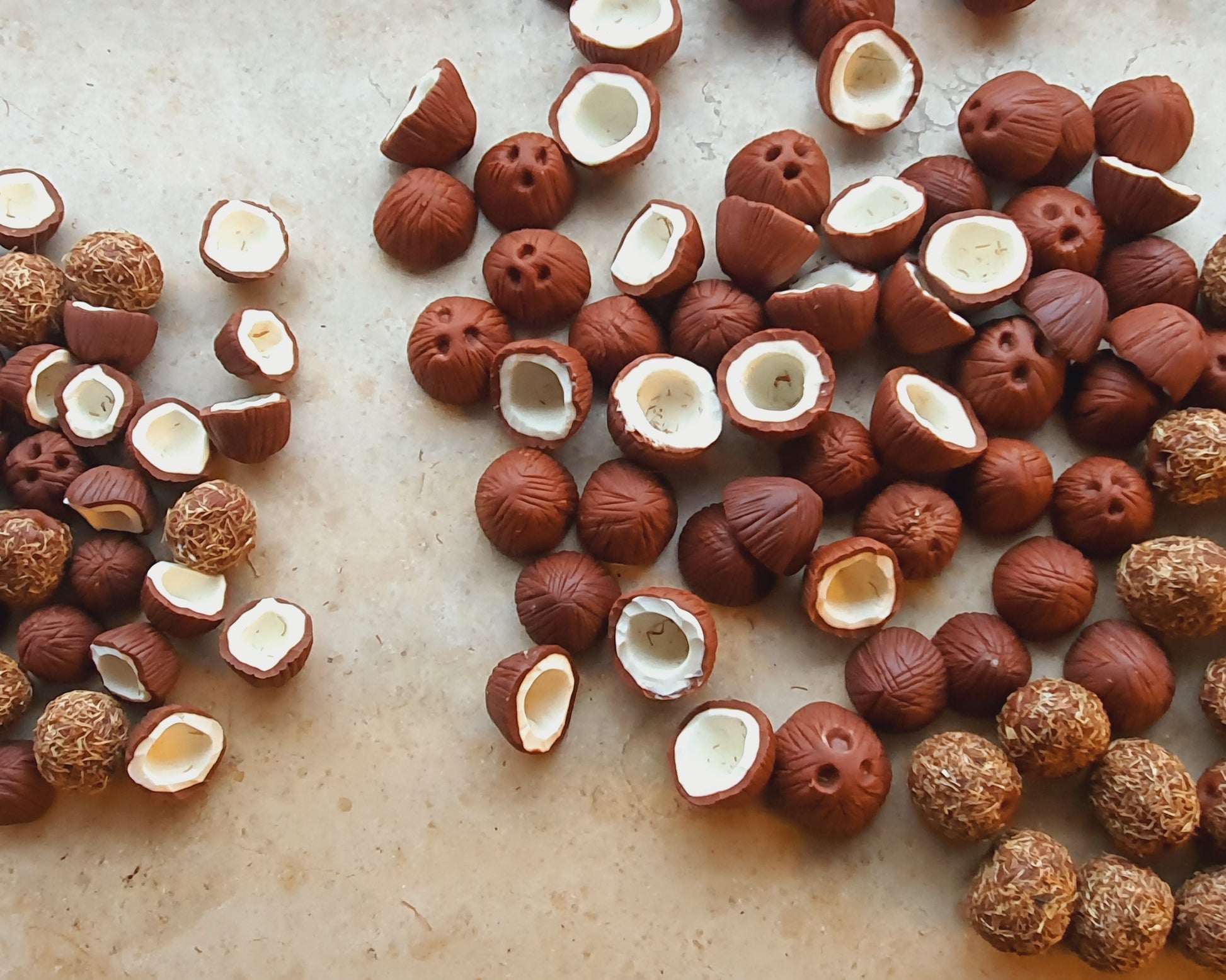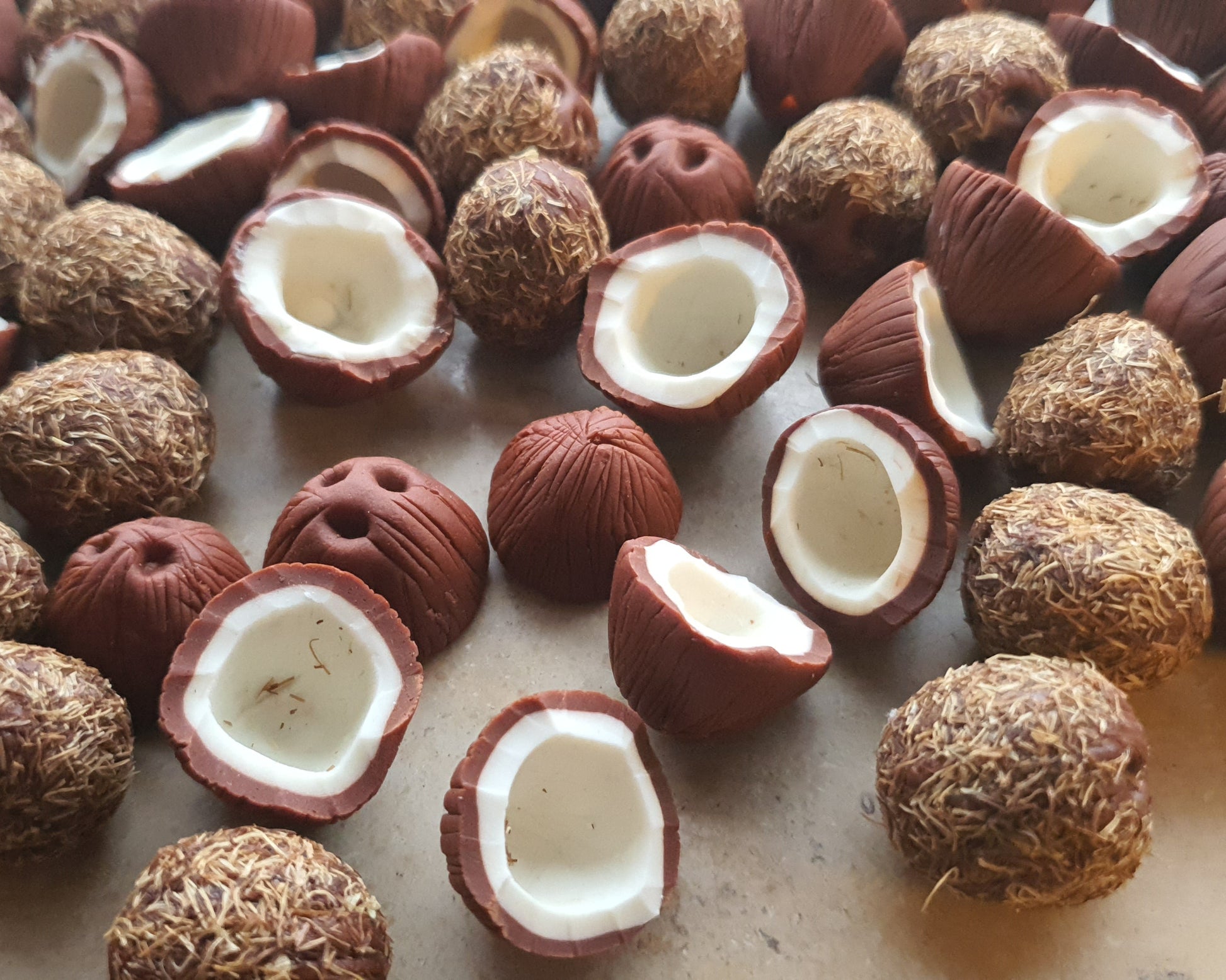 Miniatur Kokosnuss aus Fimo für eine Puppenstube.