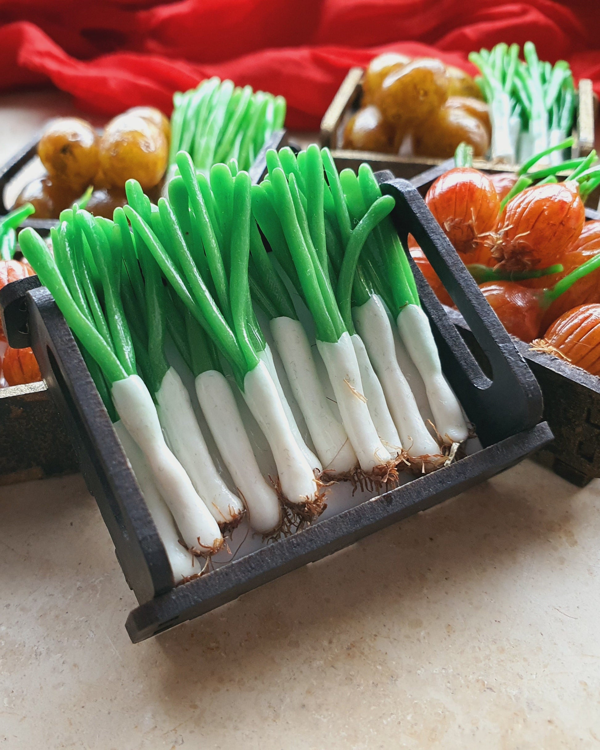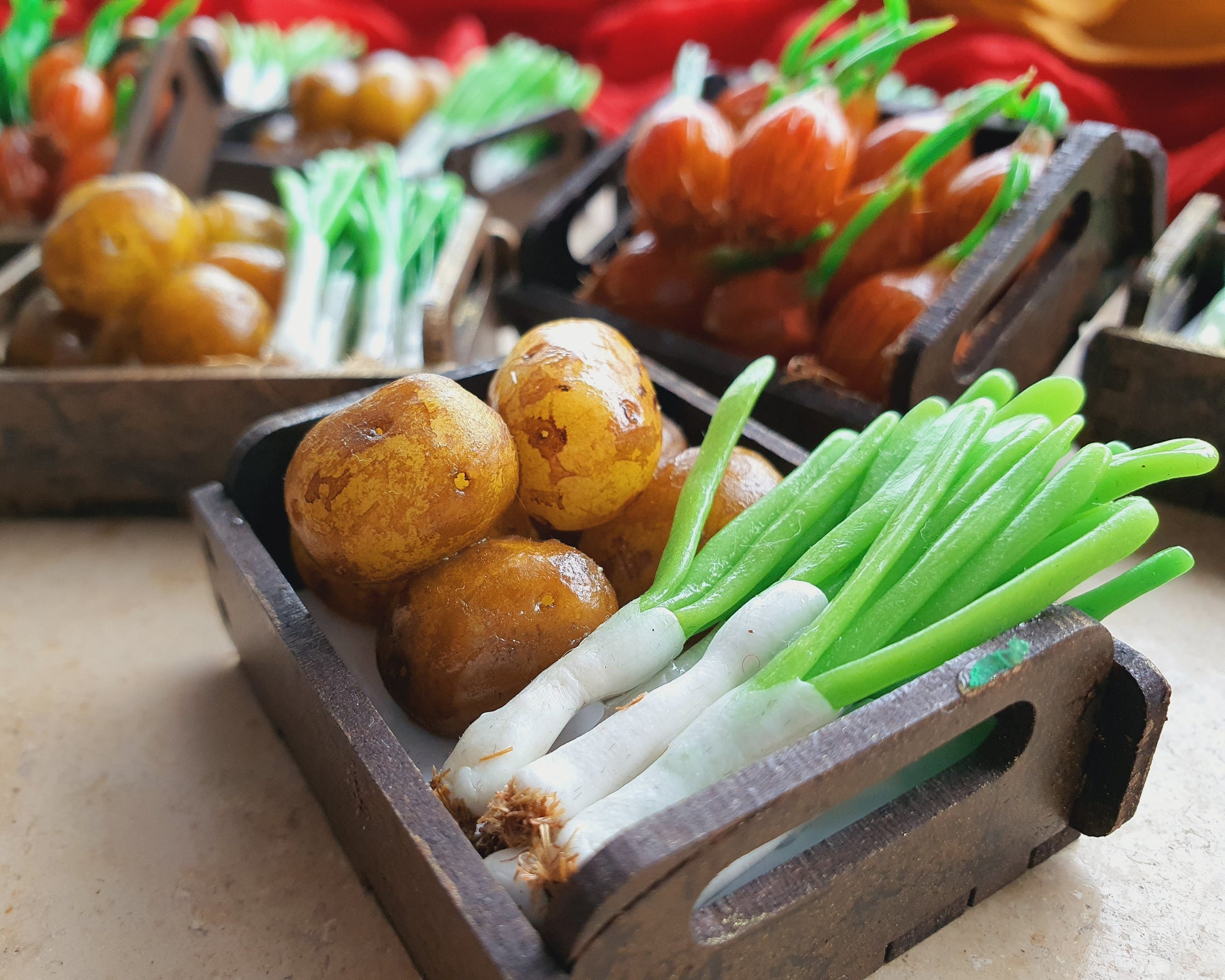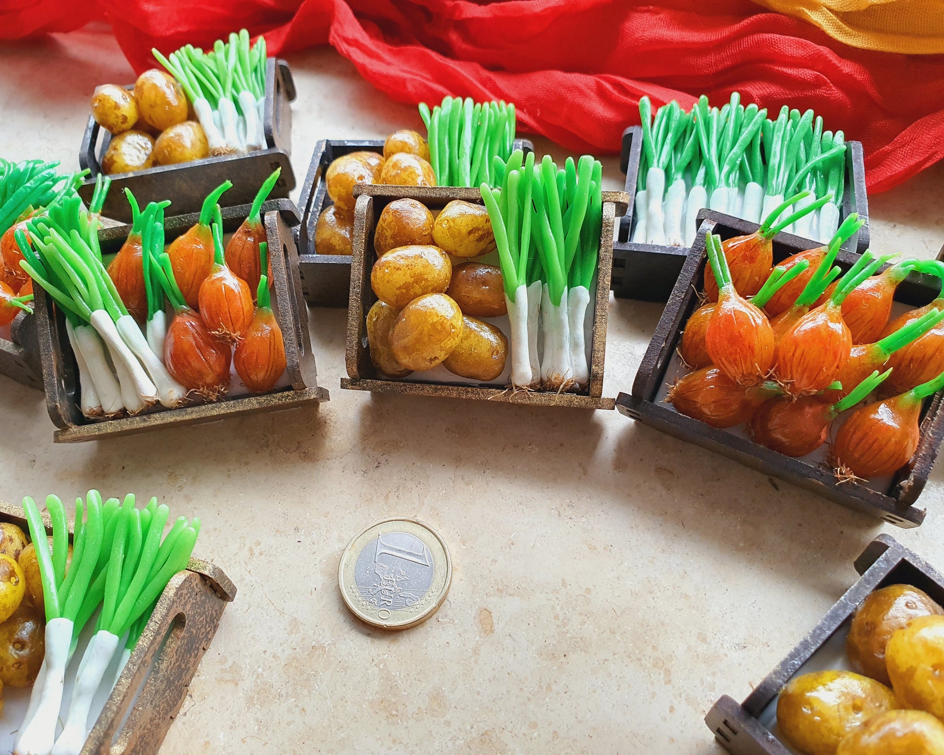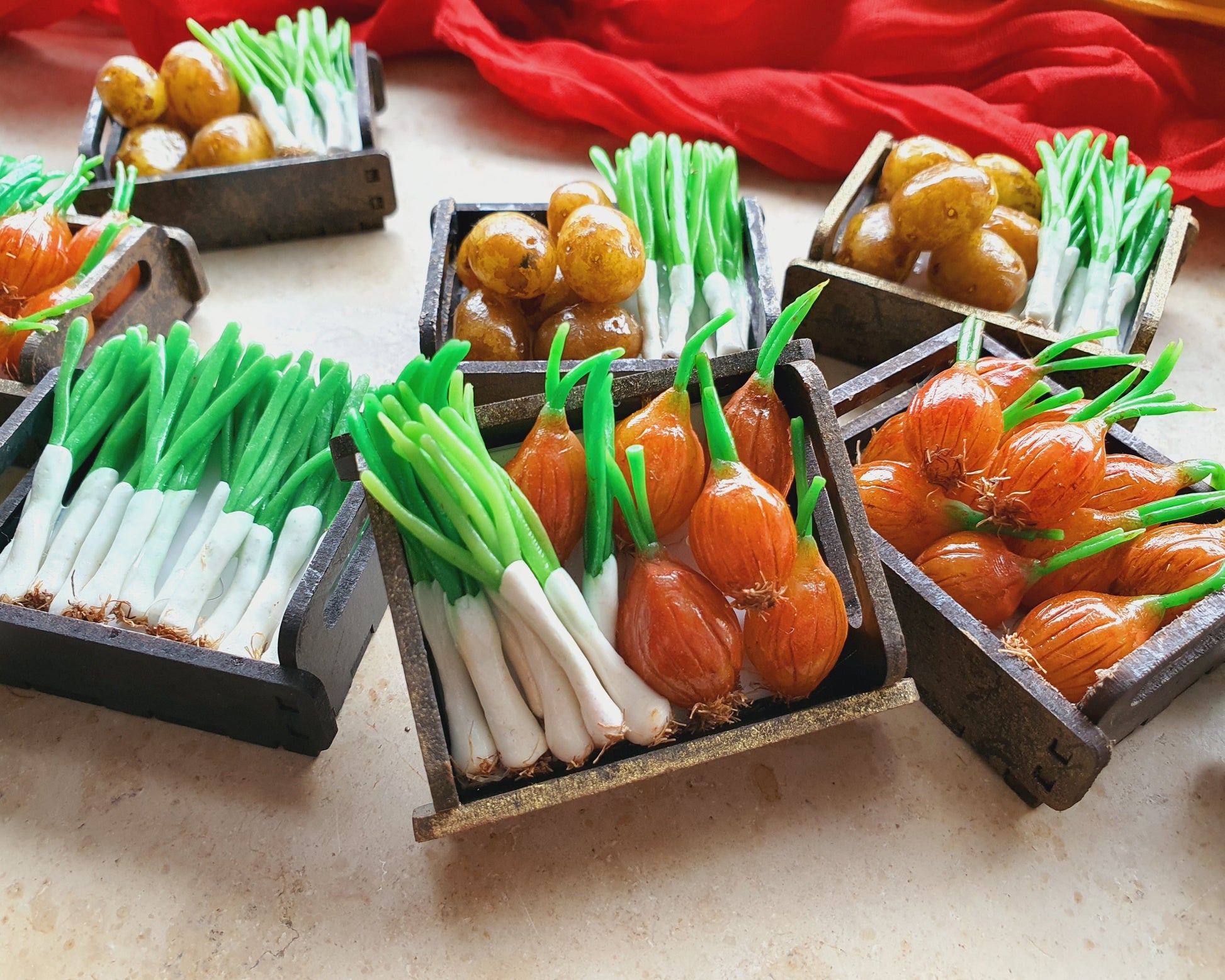 Unsere Miniatur-Lauchzwiebel-Zwiebelkiste bringt ländlichen Marktplatz-Charme ins Puppenhaus. Die Kombination aus kräftigen Zwiebeln und frischen Lauchzwiebeln sorgt für ein naturgetreues, lebendiges Detail – wie frisch vom Wochenmarkt.