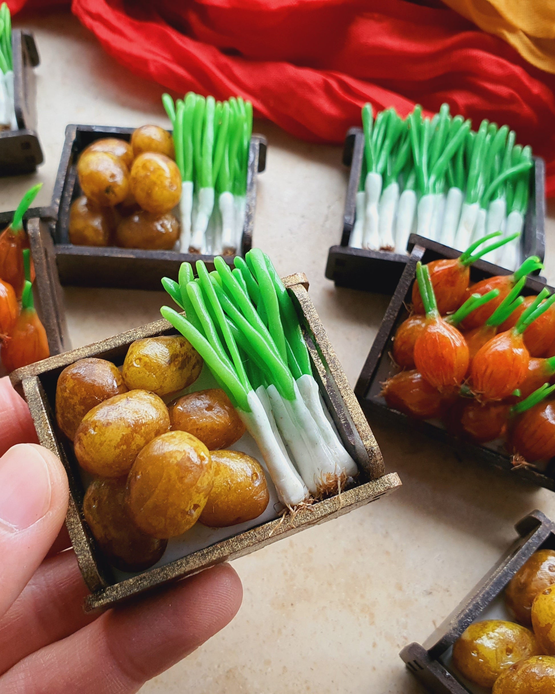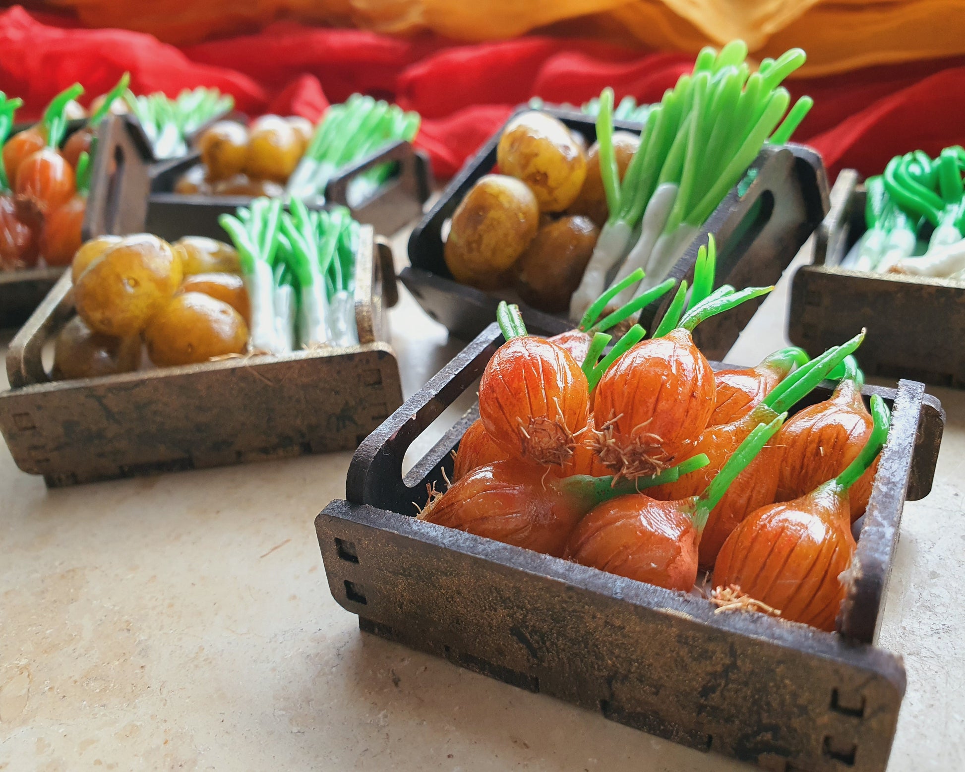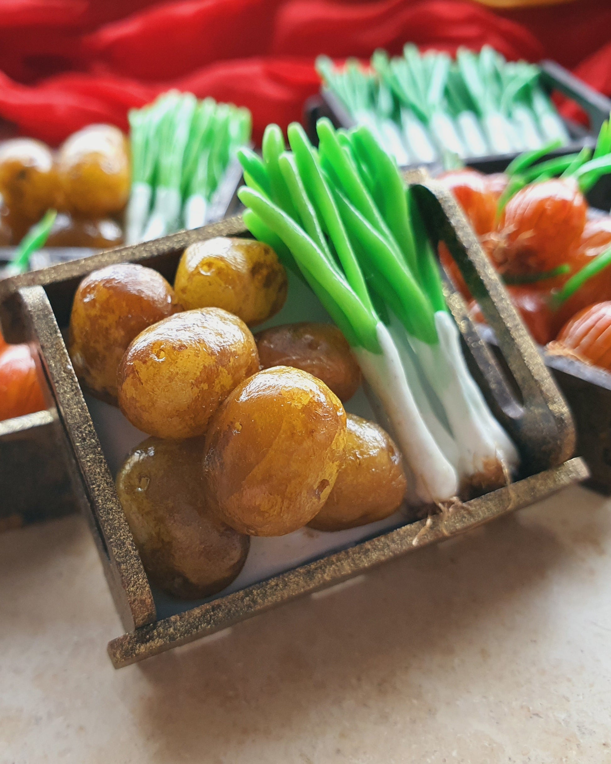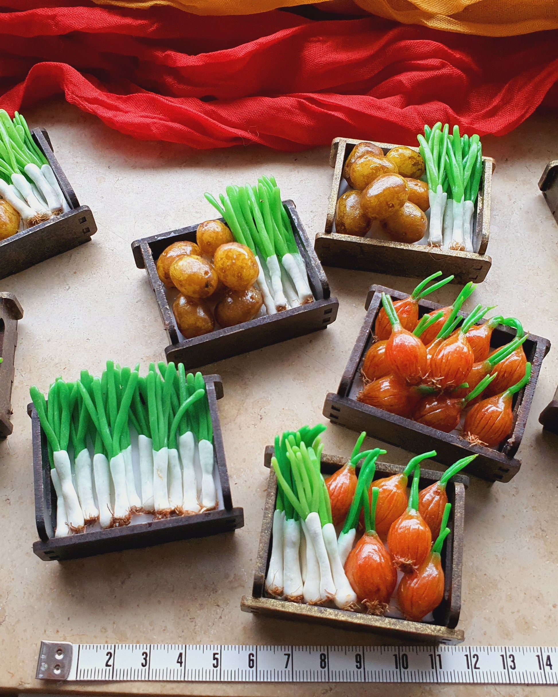 Unsere Miniatur-Lauchzwiebel-Zwiebelkiste bringt ländlichen Marktplatz-Charme ins Puppenhaus. Die Kombination aus kräftigen Zwiebeln und frischen Lauchzwiebeln sorgt für ein naturgetreues, lebendiges Detail – wie frisch vom Wochenmarkt.