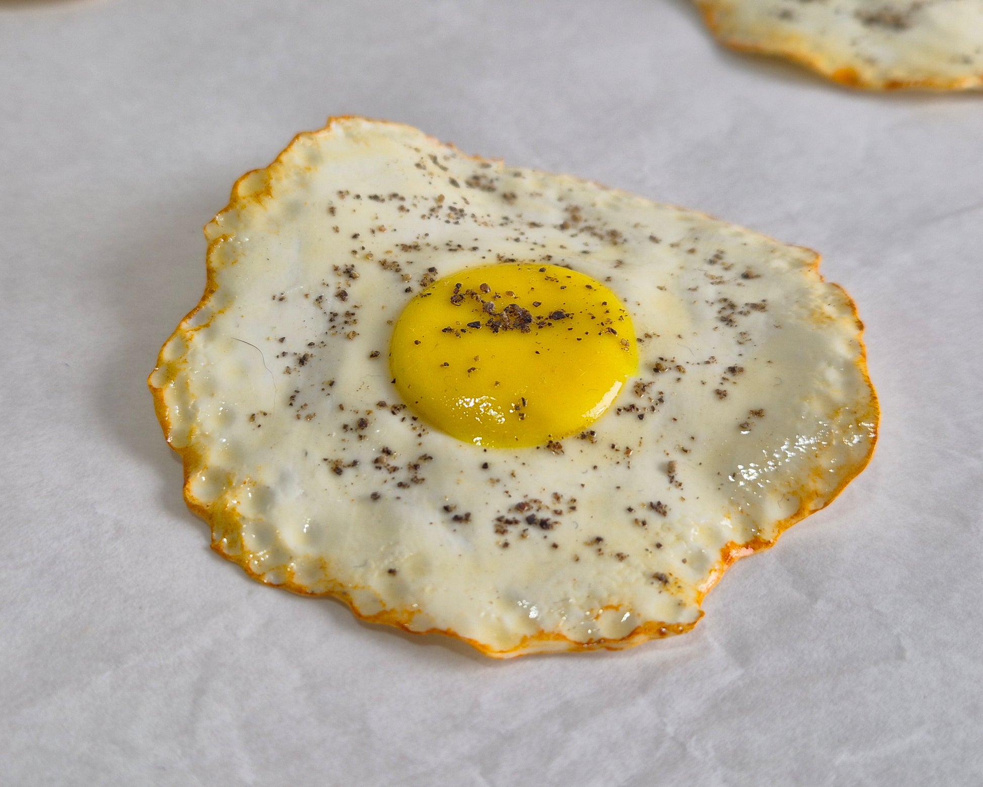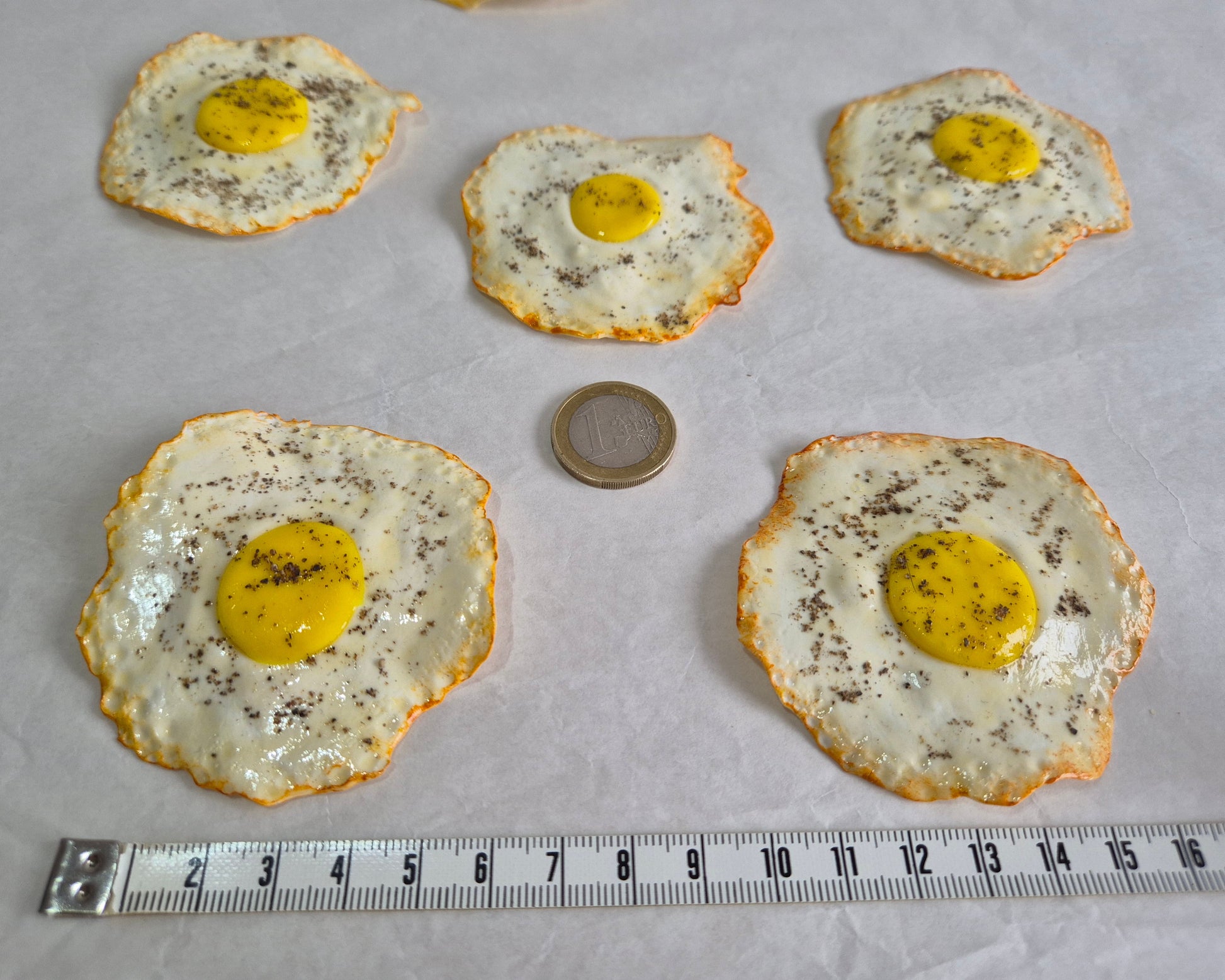 Diese kleinen Spiegeleier sehen täuschend echt aus, sind aber liebevoll von Hand aus Fimo gefertigt. Mit ihrem realistischen Look bringen sie einen Hauch von Frühstücks-Charme in jede Szene!